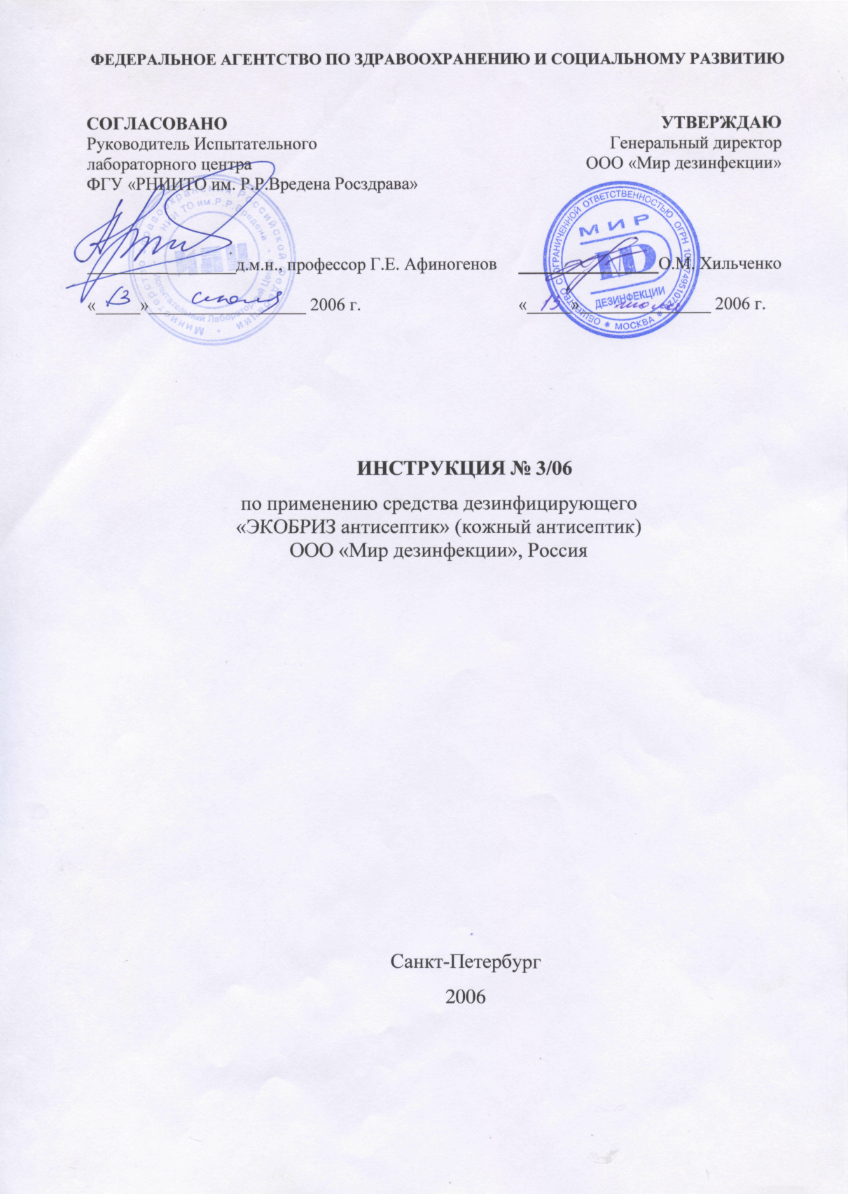 ![]() ИНСТРУКЦИЯ № 3/06 по применению средства дезинфицирующего «ЭКОБРИЗ антисептик» (кожный антисептик) ООО «Мир дезинфекции», Россия Инструкция Разработана в Испытательном лабораторном центре ФГУ «РНИИТО им. Р.Р.Вредена Росздрава». Авторы: А.Г. Афиногенова, Т.Я. Богданова, Г.Е. Афиногенов. 1. ОБЩИЕ СВЕДЕНИЯ 1.1. Средство представляет собой готовый к применению кожный антисептик в виде бесцветной прозрачной жидкости с характерным запахом. Содержит в качестве действующих веществ изопропиловый спирт, комплекс четвертичных аммониевых солей, а также увлажняющие и другие вспомогательные компоненты. Средство выпускается в полимерной таре вместимостью 0,1 дм3, 0,2 дм3, 0,5 дм3, 1 дм3 и 5 дм3 или другой по требованию заказчика. Срок годности средства – 5 лет в невскрытой герметичной упаковке изготовителя. 1.2. Средство обладает активностью в отношении грамположительных (включая микобактерии туберкулеза) и грамотрицательных бактерий, вирусов (гепатит В, ВИЧ), дрожжеподобных грибов рода Кандида. 1.3. Средство по параметрам острой токсичности, согласно классификации ГОСТ 12.1.007-76, при нанесении на кожу и введении в желудок относится к 4 классу малоопасных соединений. Местно-раздражающие, кожно-резорбтивные и сенсибилизирующие свойства в рекомендованных режимах применения у средства не выражены. ПДК изопропанола в воздухе рабочей зоны 10 мг/м3, 3 класс опасности (пары). ПДК ЧАС в воздухе рабочей зоны 1 мг/м3 (аэрозоль) - 2 класс опасности, требуется защита кожи и глаз. 1.4. Средство предназначено в качестве кожного антисептика: - для гигиенической обработки рук медицинского персонала в лечебно-профилактических учреждениях, рук медицинских работников детских дошкольных и школьных учреждений, учреждений соцобеспечения, работников парфюмерно-косметических предприятий, общественного питания, коммунальной службы (в т.ч. в парикмахерских и косметических салонах, салонах красоты), населением в быту; - для обработки рук хирургов, операционных медицинских сестер и других лиц, участвующих в проведении операций, в лечебно-профилактических учреждениях; - локтевых сгибов доноров, кожи операционного и инъекционного полей. ^ 2.1. ГИГИЕНИЧЕСКАЯ ОБРАБОТКА РУК: не менее 3 мл средства наносят на кисти рук и втирают в кожу и межпальцевые пространства до полного высыхания, но не менее 30 сек. Для профилактики туберкулеза и вирусных инфекций обработку рук проводят дважды, используя каждый раз не менее 3 мл средства, общее время обработки — 60 сек. 2.2. ^ перед применением средства кисти рук и предплечья моют теплой проточной водой и мылом (например, Чистота) в течение 2 мин, высушивают стерильной марлевой салфеткой. Затем на сухие руки наносят средство (не менее двух порций по 5 мл) и втирают в течение 2,5 минуты в кожу кистей рук и предплечий, а так же между пальцами, поддерживая кожу во влажном состоянии в течение времени обработки. Общее время обработки средством составляет 5 минут. Стерильные перчатки надевают после полного высыхания средства. 2.3. ^ кожу двукратно протирают раздельными стерильными марлевыми тампонами, обильно смоченными средством. Время выдержки после окончания обработки – 2 минуты. Накануне операции больной принимает душ, меняет белье. 2.4. ^ : кожу протирают стерильным ватным тампоном, обильно смоченным средством, Время выдержки после окончания обработки – 1 минут